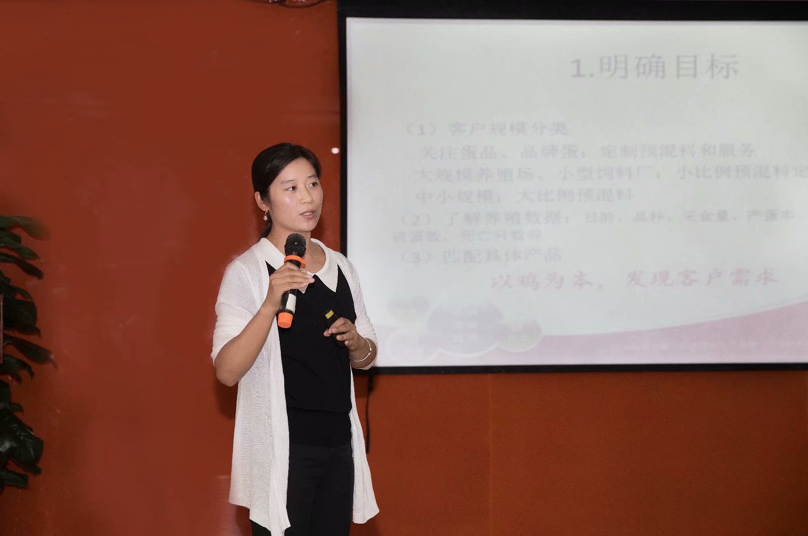 技術(shù)經(jīng)理李桂霞女士,從蛋雞產(chǎn)品著手,對(duì)各類產(chǎn)品配方設(shè)計(jì)原理,客戶使用后產(chǎn)生的效果,每個(gè)產(chǎn)品的設(shè)計(jì)更具有針對(duì)性,客戶規(guī)模、關(guān)注點(diǎn)都對(duì)產(chǎn)品需要不一樣,一個(gè)產(chǎn)品不同使用階段配方要及時(shí)調(diào)整,以達(dá)到蛋雞更好的水平。學(xué)員也根據(jù)自己市場(chǎng)的實(shí)際情況來分析、分類客戶,給客戶提供給適合的產(chǎn)品,提高客戶收益。