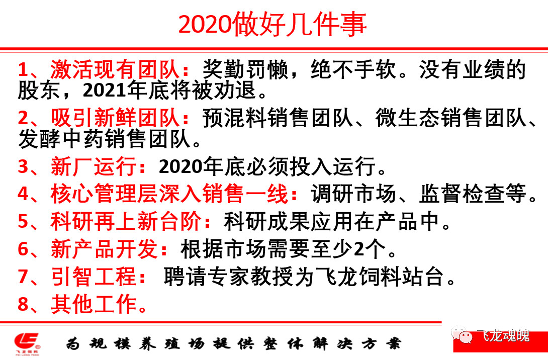本次會議,范東良總經(jīng)理做了2019年的經(jīng)營業(yè)績匯報,在豬瘟疫情的不利影響下,飛龍飼料堅持打造飛龍財富共同體平臺,堅持產(chǎn)品創(chuàng)新、營銷模式創(chuàng)新,堅持以質(zhì)量高售價低、多渠道為養(yǎng)殖戶服務(wù),鏈接客戶、鍛煉營銷隊伍,取得了不錯的經(jīng)營成績。同時對2020年全體員工的工作,提出了明確的、30%銷售增量的要求: