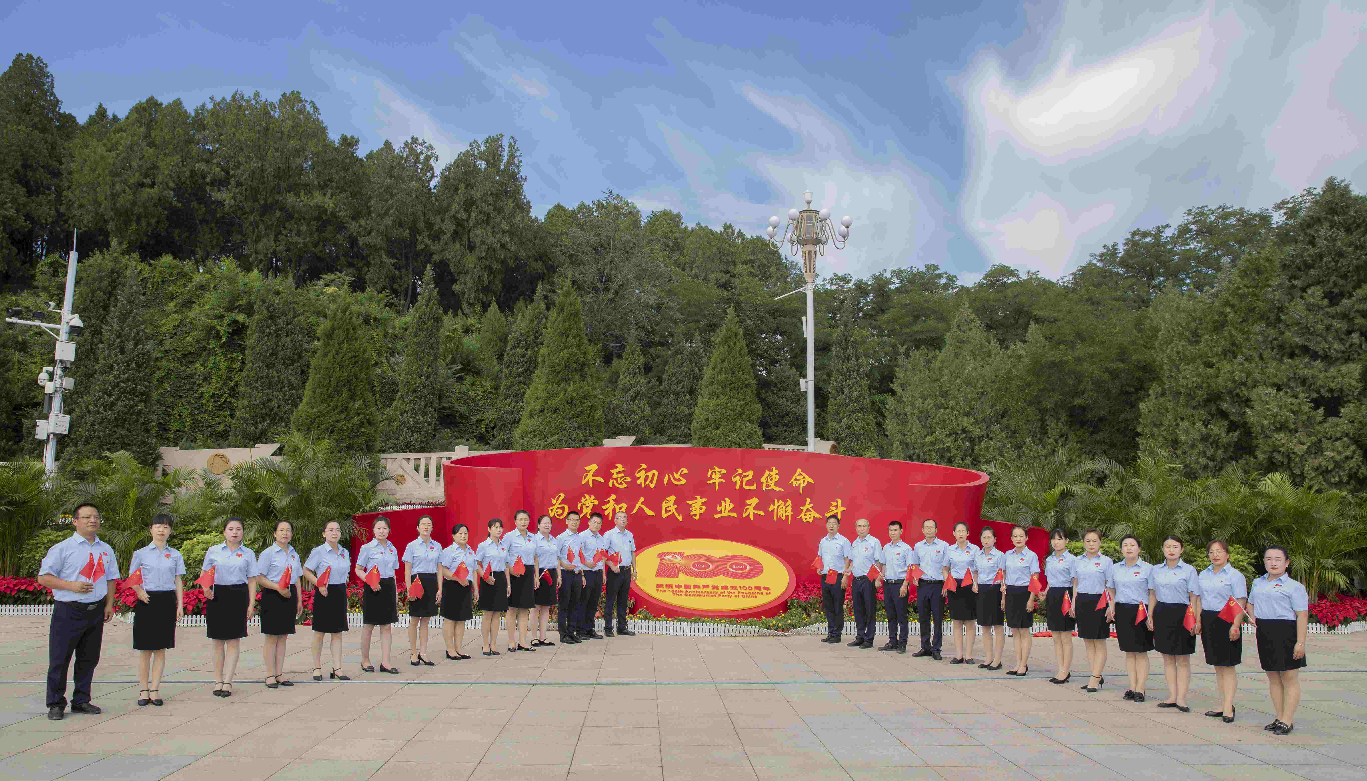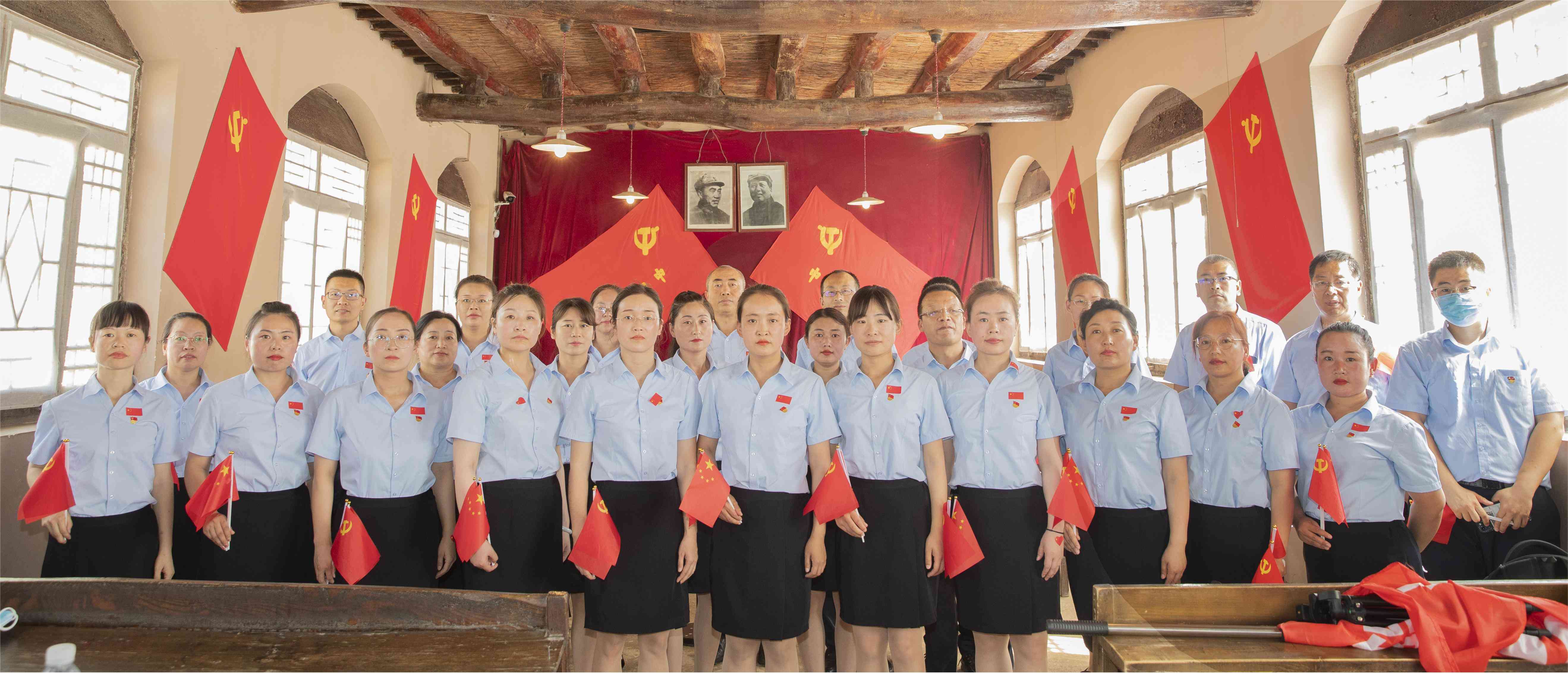 在莊嚴的黨旗下,全體員工高唱《沒有共產(chǎn)黨就沒有新中國》。